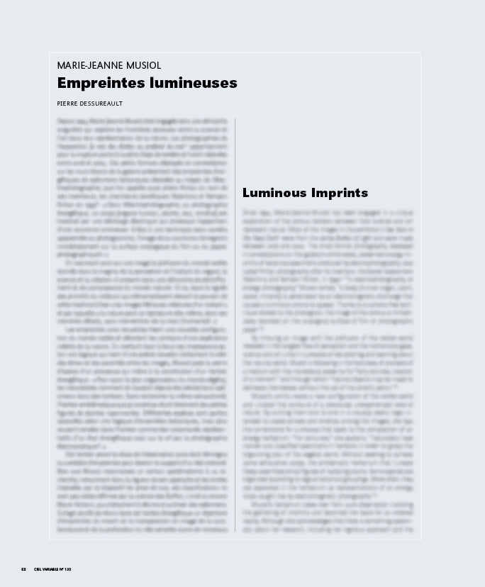 Pierre Dessureault, « Marie-Jeanne Musiol, Marie-Jeanne Musiol, Empreintes lumineuses », Ciel variable, nº 130, « Plantes et jardins », Montréal, 2025, p. 52-59.